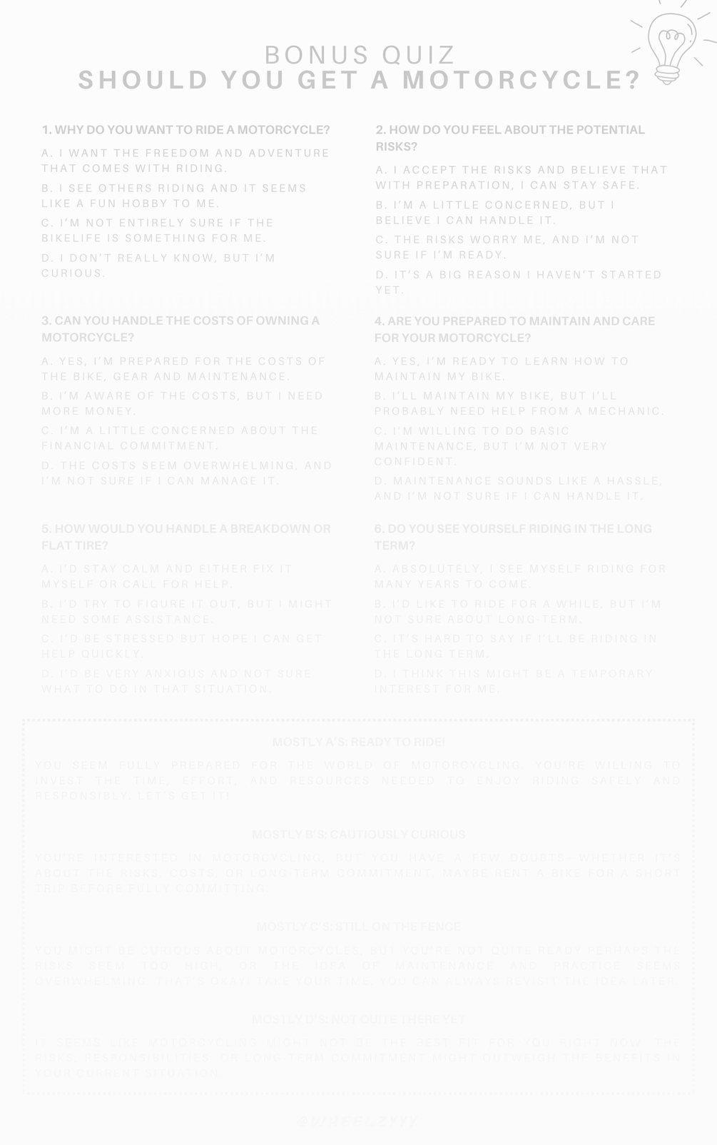 - Bonus Quiz: Take a quiz to find out if getting a motorcycle is the right choice for you!
